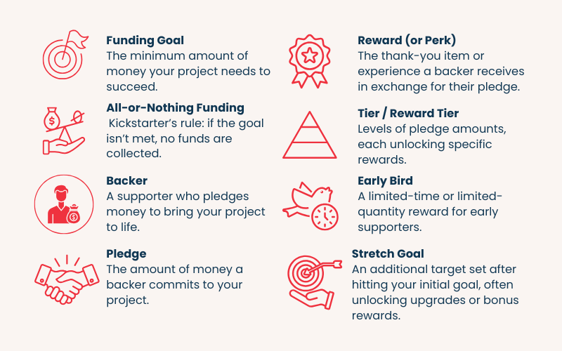 👉 Kickstarter can seem a bit intimidating, and it comes with its own set of terms that might feel confusing at first. To make things easier, here’s a quick glossary of the ones you’ll run into most often.